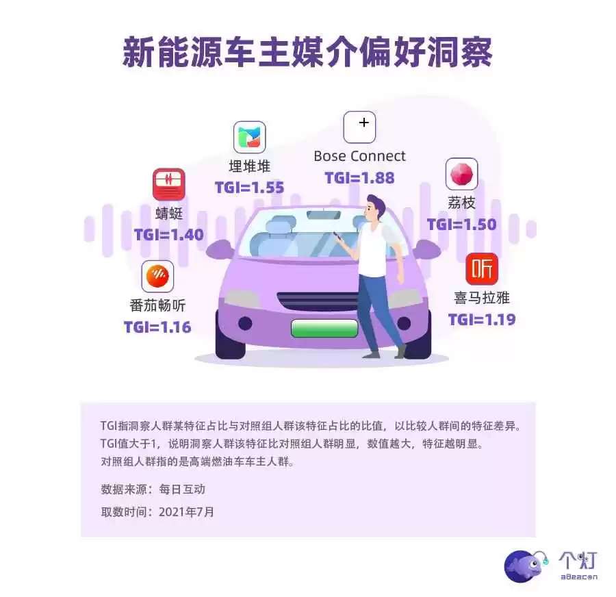 数据显示,相比燃油车车主,新能源车主人群更喜欢的电台类App是荔枝FM和蜻蜓FM,更爱的听书类App则是喜马拉雅和番茄畅听。