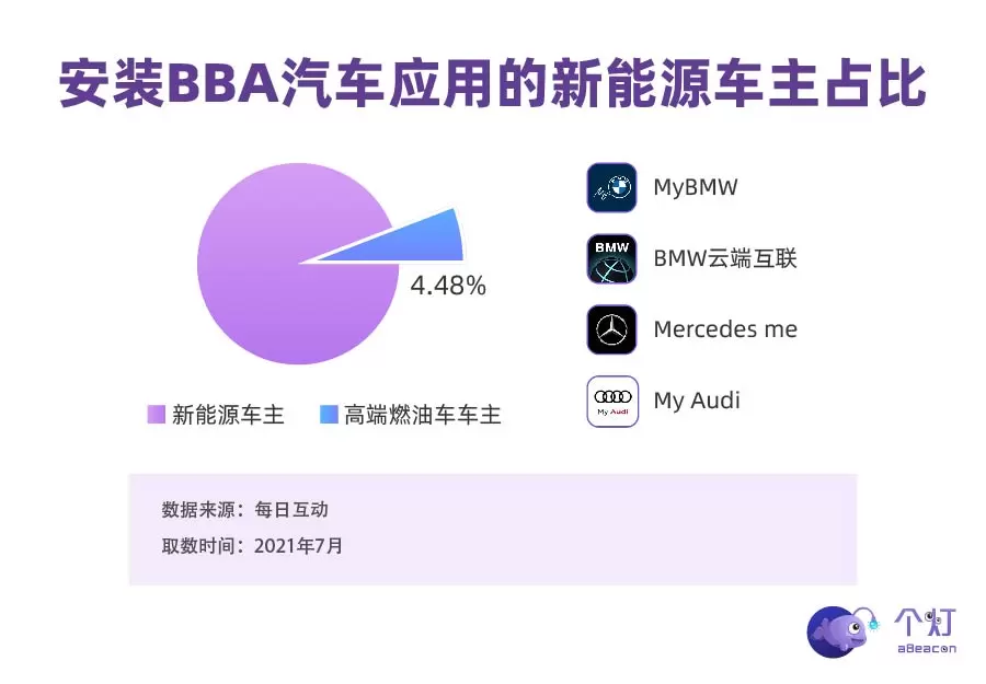 我们使用个灯数盘对新能源车主的线上应用偏好进行了分析,发现不少新能源车主还同时安装了宝马、奔驰、奥迪等高端燃油汽车品牌的App,比如MyBMW、Mercedes me、My Audi等,这说明很多新能源车主同时也是BBA车主,新能源车并非他们家里唯一的一辆车。