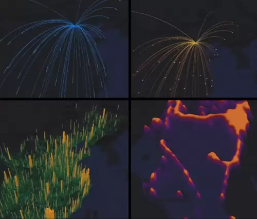 除了基础的静态绘制能力之外,腾讯位置服务的这套数据可视化模块还提供了图形的动效显示能力。例如在人口迁徙场景中,可以通过弧线的动态流向,来表现人口迁徙的方向。又比如在公园游客分布场景中,可以加入不同高度的动态拔起效果,来体现人流热力数据按时间变化的情况。还有散点图层的辐射动效,轨迹图的脉冲动效等等,这些丰富的动态效果让数据更加鲜活。