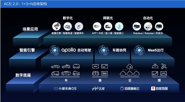 这些核心能力都来源于百度智能交通解决方案——ACE智能交通引擎。近期,百度ACE智能交通引擎从1.0版本升级到了2.0版本,在数字底座、智能引擎、场景应用以及“车路云图”产品矩阵等方面实现了全面升级,在“自动驾驶”和“车路协同”基础上新增“MaaS出行服务”智能引擎,升级为“1+3+N”总架构,将“出行即服务”纳入全场景智能交通解决方案当中,助力更多地方政府打造具有独特性的城市智能交通。