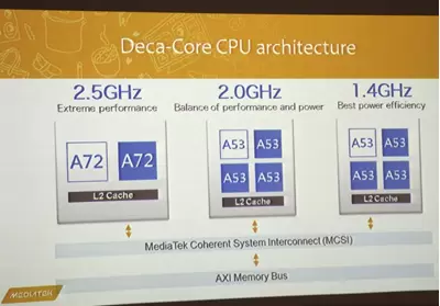 这与联发科Tri-Cluster架构的理念十分接近,当时该架构为2+4+4核心,以20mm制程生产。该Tri-Cluster架构,提供三个丛集的处理器,专为处理移动设备的各种高度、中度及轻度负载工作项目所设计。Tri-Cluster 架构包含两颗ARM Cortex-A72所组成的单架构(以2.5GHz工作频率运作,提供极致性能);以及二个内含四颗ARM Cortex-A53的架构(其中一个架构负责中等负载任务,以2.0GHz频率运作;另一个则负责执行轻度负载任务,以1.4GHz频率运作)。如同为车辆添加推进器,把核心划分为三层架构,可更有效地分配工作,达到更理想的性能表现,同时延长电池寿命。