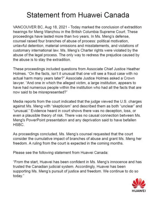 华为加拿大的声明见下:“华为一直相信孟女士是清白的。我们也一直相信加拿大的司法体系。华为一直支持孟女士寻求正义和自由,今天我们依旧坚持这一立场。”