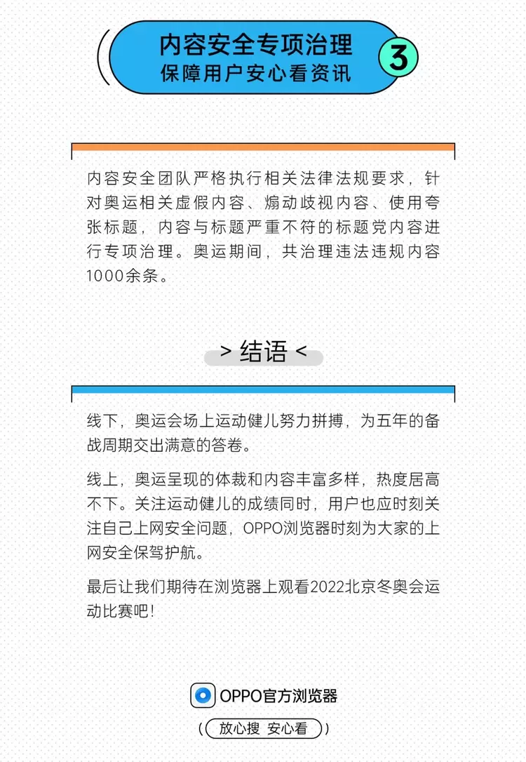 在本次奥运会期间,OPPO内容安全团队还进行了内容安全专项治理,严控奥运相关虚假、歧视信息,严抓“标题党”,让用户了解真实的奥运世界,放心“冲浪”!一直以来,OPPO始终将提升用户体验放在首位,OPPO浏览器在奥运期间的全程守护正体现了平台“防范未然”,一切以保障用户隐私安全为先的产品理念。