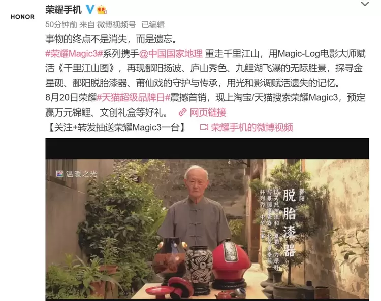 以鲜活影像再现流传千年的水墨江山、探寻背后文化坚守,荣耀的创新科技不再是冰冷的科技产品,同时也将社会责任融于产品之中,化身非遗文化的“记录者”,用科技助力千年文化的传承与守护。