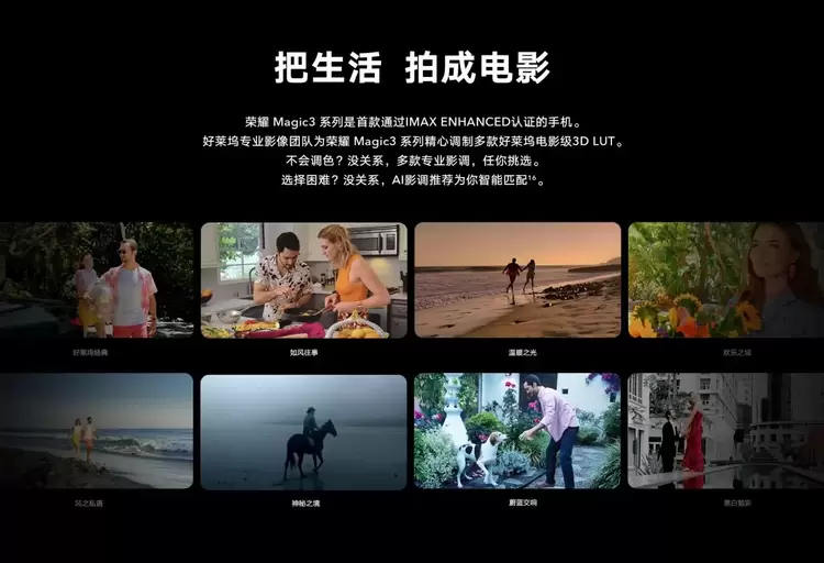 荣耀Magic3系列首次将电影工业视频流程AI化,联合好莱坞大师定制8种风格电影级3DLUT,让普通人也能拍出电影质感作品;首创的AI影调推荐功能,能够根据场景智能匹配并推荐适合的LUT风格;专业log文件格式,拍摄时能在高光和阴影保留更多的有效信息,提供更高的动态范围,给后期创作保留更大空间,推动手机摄影进入电影工业专业流程。