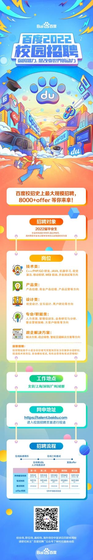 如此炫酷和丰富的技术实力与成果展示,离不开百度内部源源不断的人才贡献。不久前,百度2022届校园招聘也官宣启动,新一批AI生力军招募正式拉开帷幕。本届校招面向海内外2022届毕业生,开放技术、产品、设计、政企解决方案、专业/职能五大类型岗位,计划发放8000余个offer,是百度史上规模最大的校园招聘。应届毕业生百度搜索“百度招聘”登录官网,进入“校园招聘”页面即可查看具体信息并投递简历。