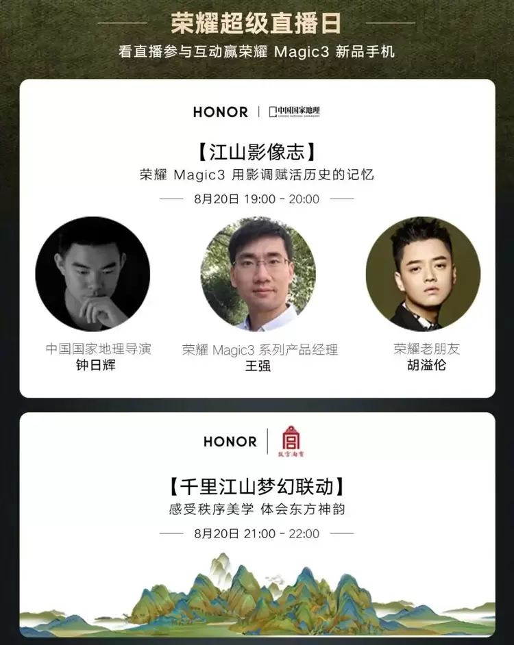 荣耀Magic3系列携手中国国家地理、天猫超级品牌日赋活《千里江山图》的视频,借助荣耀Magic3系列的电影工业级影像,唤醒了大家对逐渐被遗忘的文化记忆的关注,一经上线反响热烈。今晚19点-20点的“江山影像志”直播盛典,将由中国国家地理导演与荣耀Magic3系列产品经理一起,畅聊赋活《千里江山图》的拍摄之旅,解密荣耀Magic3系列电影级3D LUT如何呈现对非遗文化的“赋活”、Magic-log如何让后期更简单、四主摄融合计算摄影技术如何让视频呈现更好的效果。