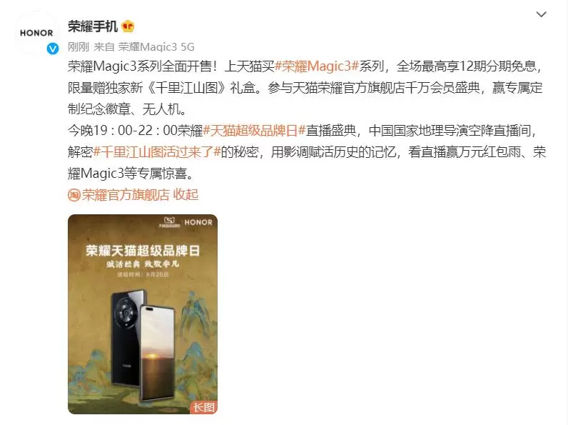8月20日10 : 08,全能科技旗舰荣耀Magic3系列全面开售。荣耀天猫超级品牌日带来了全场最高享12期分期免息、新《千里江山图》礼盒等多重购机福利,参与天猫荣耀官方旗舰店千万会员盛典,还有机会赢会员专属纪念章、大疆无人机。不仅如此,为了满足大家的好奇心,今晚19点,中国国家地理导演还将空降天猫荣耀直播间,趣味解析影像赋活《千里江山图》的秘密,参与互动还有同款荣耀Magic3等你来拿!