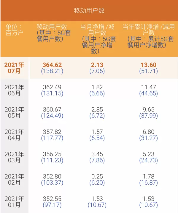 8月23日消息,中国电信公布其2021年7月份运营数据。当月,中国电信移动用户数净增213万户,移动用户数累计3.6462亿户,当月5G套餐用户净增706万,5G套餐用户累计1.3821亿户。