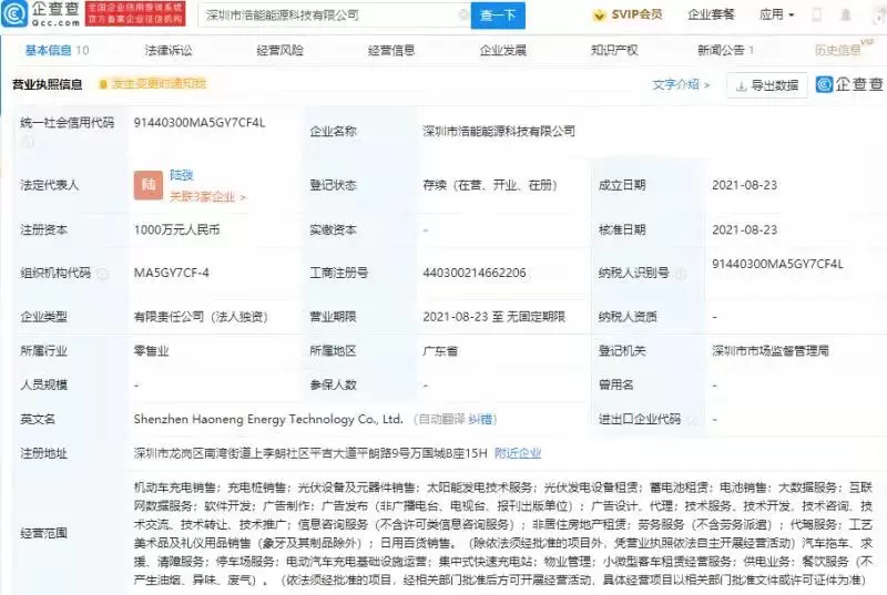企查查APP显示,8月23日,深圳市浩能能源科技有限公司成立,法定代表人为陆弢,注册资本1000万元人民币,经营范围包含:停车场服务;电动汽车充电基础设施运营;集中式快速充电站;物业管理;小微型客车租赁经营服务;供电业务等。