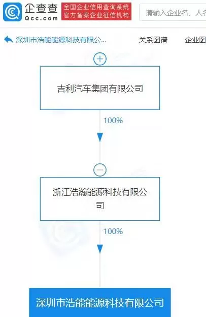 企查查股权穿透显示,该公司由浙江浩瀚能源科技有限公司100%控股,后者为吉利汽车集团有限公司全资子公司。
