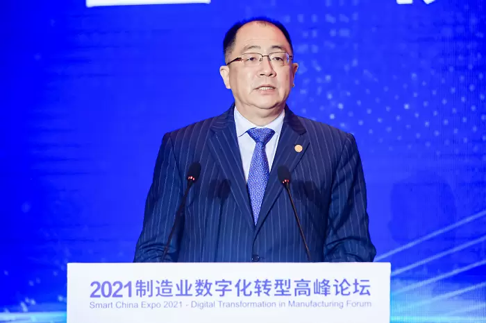 图为高通公司中国区董事长孟樸在2021智博会制造业数字化转型高峰论坛上发表演讲
