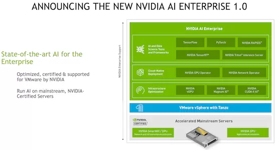 本次上市的AI Enterprise,是一套综合全面的AI工具和框架软件,能够帮助成千上万的运行VMware vSphere的公司在NVIDIA认证系统上实现AI工作负载的虚拟化。据悉,英伟达AI Enterprise可让使用VMware vSphere来运行传统企业应用的IT专业人士能够轻松、经济高效地支持AI工作负载,同时使用原有工具来管理大型数据中心和混合云。