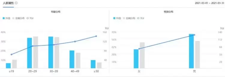 从人群属性中的年龄分布可以观察到,抖音用户年龄段分布比较广泛的,小于19岁的青少年群体约占7%。若按抖音背靠的6亿大基数的日活用户数量估计,抖音青少年群体的日活也能达到4200万。