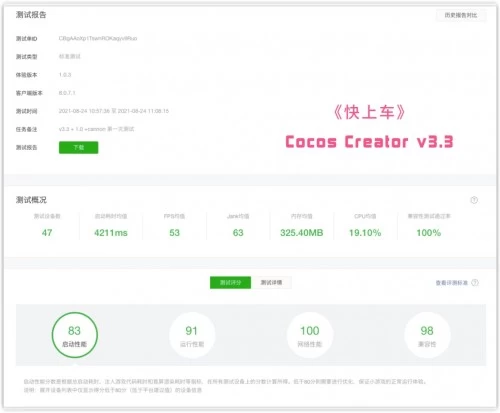 通过测试发现,Cocos Creator 3.3 的启动性能、运行性能和物理性能都有了极大提升,特别是在小游戏平台,三项重要数据都达到了80分以上,启动性能更是翻了一番,而启动性能的优劣是能直接影响到用户的去留问题,这意味着所有开发者可以用更快的时间获客,在买量成本不带攀升的游戏行业,这无疑是极具竞争力的一点。