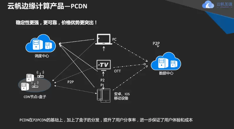 众多周知,PCDN在扁平传输模型面临严峻政策和监管风险,其中去中心化网络,内容难以管理;在调度方面又无法细化到市级别,服务稳定性无法保证;在使用体验也无法保证,冷门内容效果差;接入周期长,SDK嵌入难度高;适配业务类型单一,使用范围小;资源比较单一只有peer,为了解决PCDN以上这些问题,云帆加速作为CDN创新型企业将P2P与CDN相融合,并成功商业化。