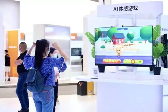 在AI体感游戏展台,体验者可直接通过摄像头实现与大屏游戏的实时互动,同时设备还支持了对30个骨关节进行识别,能实现三人同时游戏,现场氛围热烈。