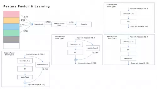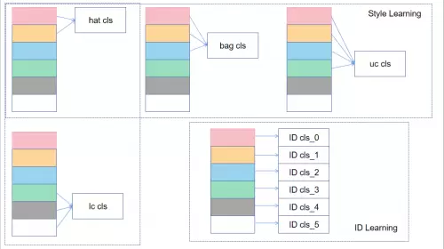 特征学习模块方面,特斯联基于BNNeck,采用“全局+局部”模式展开研究。全局层面,通过度量学习(Circle Loss + Center Loss)提取全局特征。局部细粒度特征学习层面,则首先计算每一局部模型间相关性,随后交叉融合局部模块相关性较高的特征,输入至各局部细粒度分类器,学习相应局部细粒度特征。如图所示,交叉融合可分为如下四种: