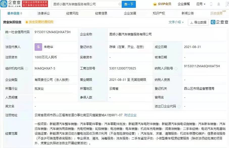 企查查APP显示,8月31日,昆明小鹏汽车销售服务有限公司成立,法定代表人为朱艳华,注册资本1000万元人民币,经营范围包含:专业保洁、清洗、消毒服务;洗车服务;二手车鉴定评估;小微型客车租赁经营服务等。