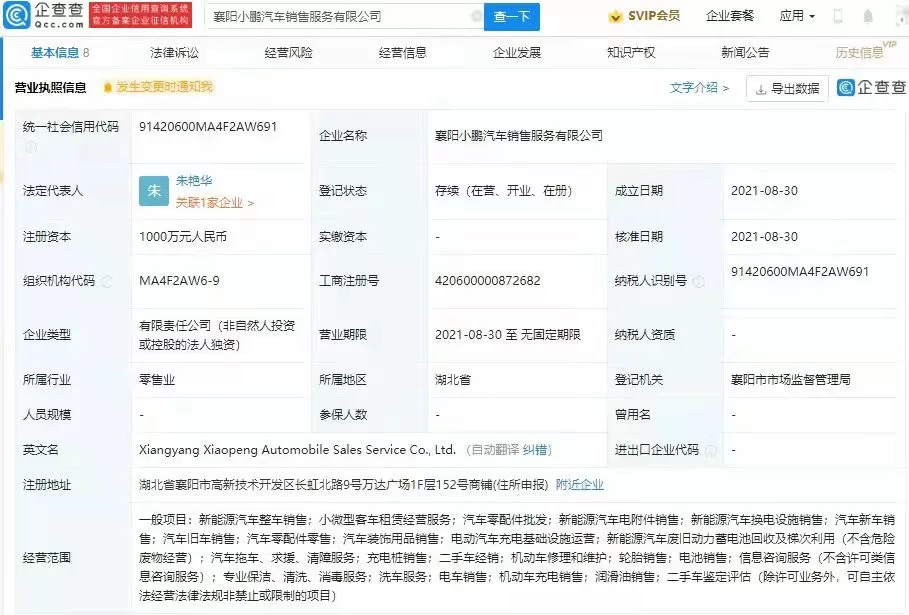 企查查APP显示,8月30日,襄阳小鹏汽车销售服务有限公司成立,法定代表人为朱艳华,注册资本1000万元人民币,经营范围包含:新能源汽车整车销售;小微型客车租赁经营服务;汽车零配件批发;新能源汽车电附件销售等。