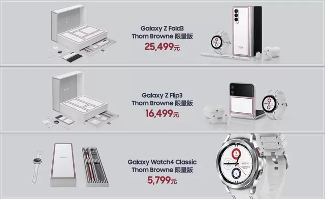 为了让科技与时尚更深层次地融合,并满足众多走在潮流前沿消费者的需求,三星再度携手ThomBrowne,为此次推出的三星Galaxy新品附上了更具标志性的外观设计,将工艺品质与视觉品味结合带来的时尚韵味提升到新的高度。无论是白色哑光背板、银色铰链,还是嵌于机身上的Thom Browne标志性色彩元素,均造就了与众不同的时尚品味,为消费者带来只属于三星与Thom Browne的独特气质与鲜明个性。三星Galaxy Z Fold3 5G Thom Browne版建议零售价25,499元,三星Galaxy Z Flip3 5G Thom Browne版建议零售价16,499元,9月8日上午10:08正式开抢,三星Galaxy Watch4 Classic Thom Browne版建议零售价5,799元,将于10月中旬开抢,敬请期待。