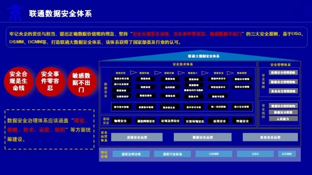 对于企业推进数字化来说,数据则是核心资产和核心生产力,大量的数据汇集到一起,根据不同业务和需求进行精细化治理最终实现价值转化,带来提质增效的成果。中国联通自2012年起开始组建全国数据中心,在三家运营商中最早实现了全国31省的数据集中,开始在内部探索深挖数据要素价值。随之而来的,当大量重要的数据要素汇集到一起,安全风险自然倍数叠加。自数据集中运营之初,中国联通高度重视数据安全治理工作,提出“安全合规是生命线、安全事件零容忍、敏感数据不出门”三大安全原则,从安全组织、安全策略,安全技术及安全运营四个方面构建了全链条的自主可控大数据安全体系。