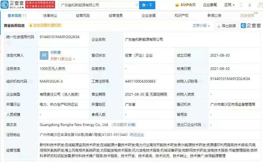 企查查APP显示,8月30日,广东融和新能源有限公司成立,法定代表人为何新勇,注册资本1000万元人民币,经营范围包含:电力行业高效节能技术研发;新兴能源技术研发;资源循环利用服务技术咨询;节能管理服务等。