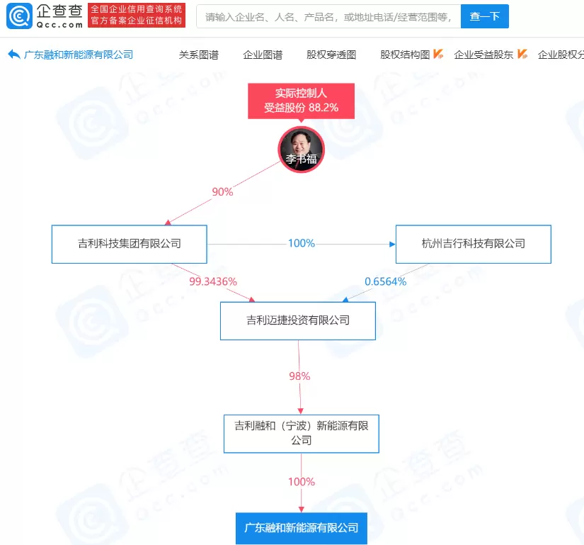 企查查股权穿透显示,该公司由吉利融和(宁波)新能源有限公司100%控股。