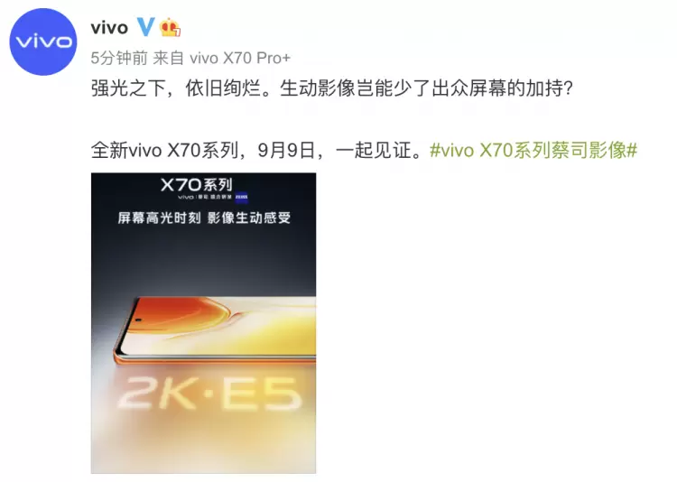 手机屏幕天花板!vivo X70系列搭载2K E5屏
