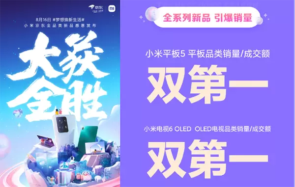 5G时代万物皆可互联,家庭生活智能化趋势日益显著,智能大屏电视成为品质生活的标配。尤其是在AI技术的推动下,电视成为智能互动的关键一环,是提升家庭娱乐生活和智能操控的重要场景和核心产品。作为战略合作伙伴,京东家电为小米电视提供强有力的销售支持,在京东618等活动期间不断刷新销量战绩——截至6月18日12:00,小米电视斩获京东平台销量及销售额双冠军;8月16日小米秋季新品小米电视6在京东开售,这款产品定位“年轻人的第一台OLED电视”,开售当天在京东平台斩获电视品类销量及销售额双第一,深受用户喜爱。