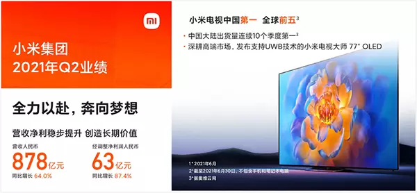 近日,小米集团公布2021年第二季度财报,营收878亿元,同比增长64.0%;经调整净利润63亿元,同比增长87.4%。其中,小米电视稳居中国市场第一、全球市场第五,并且小米电视出货量已连续10个季度在中国大陆市场保持第一。
