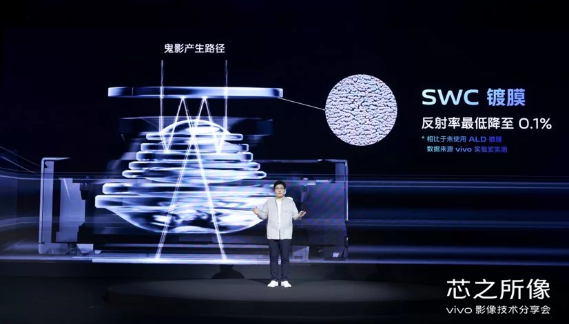 面对炫光和鬼影等行业传统难题,vivo创新引入SWC镀膜技术。基于仿生学原理,充分抑制反射光,反射率最低降低至0.1%,大幅提升纯净度。此外,vivo独家首发ALD原子层沉积工艺,在超高透玻璃镜片上形成纳米级镀膜,进一步降低光线反射。