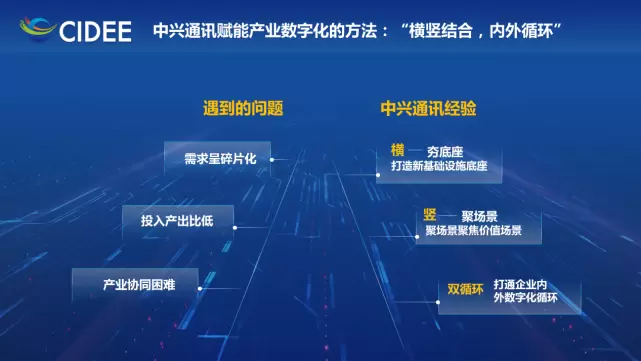 针对这三方面问题,中兴通讯也逐步摸索出了一套如何赋能产业数字化的方法,总结为“横竖结合,内外循环”。“横”是夯底座,“竖”是聚场景,内外循环是指企业内部及外部的数字化转型双循环。