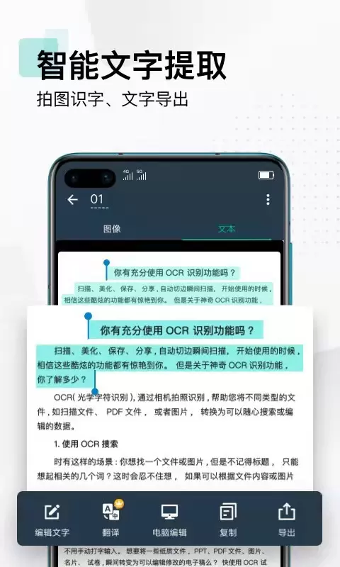 在美化调整后,拍摄的文档图片可转化为文字处理。扫描全能王支持在线编辑,多种语言翻译和文字导出等功能。此外,扫描全能王还拥有超高的识别率,印刷文档识别准确率高达99.77%,即使是手写文档也能达到97.00%的准确率。