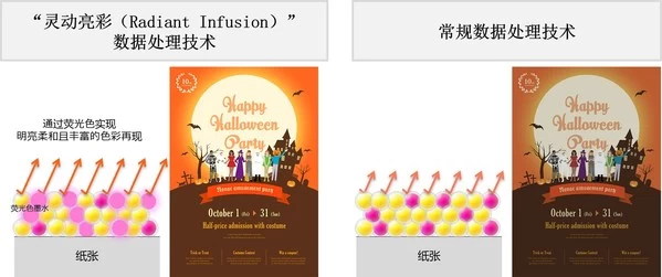 - “灵动亮彩(Radiant Infusion)”数据处理技术优化了新开发的荧光粉色墨水与其他颜色墨水在纸张表面上的叠加方式,实现明亮柔和且丰富的色彩再现,令图像表达更具冲击力。随设备附赠的海报制作软件PosterArtist Lite(详见第三段说明),可方便用户轻松迅速的设计彩色海报。