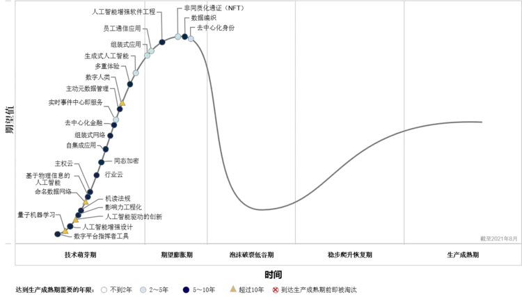 根据全球领先的信息技术研究和顾问公司Gartner最新发布的“2021年新兴技术成熟度曲线”(Hype Cycle for Emerging Technologies, 2021),建立信任,加速增长以及塑造变革将是三大主要趋势,并可推动企业机构去探索诸如非同质化通证(NFT)、主权云、数据编织、生成式人工智能和组装式网络等新兴技术从而确保竞争优势。