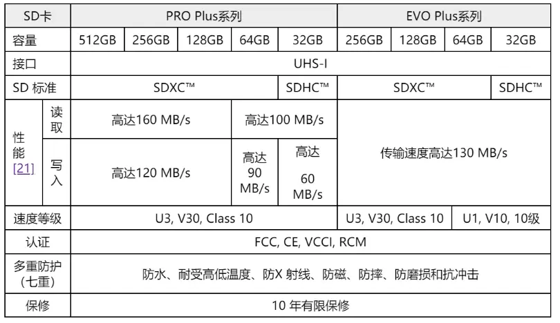 SD 卡的容量范围从 32GB 到 256GB,PRO Plus 系列新增了 512GB 选项。
