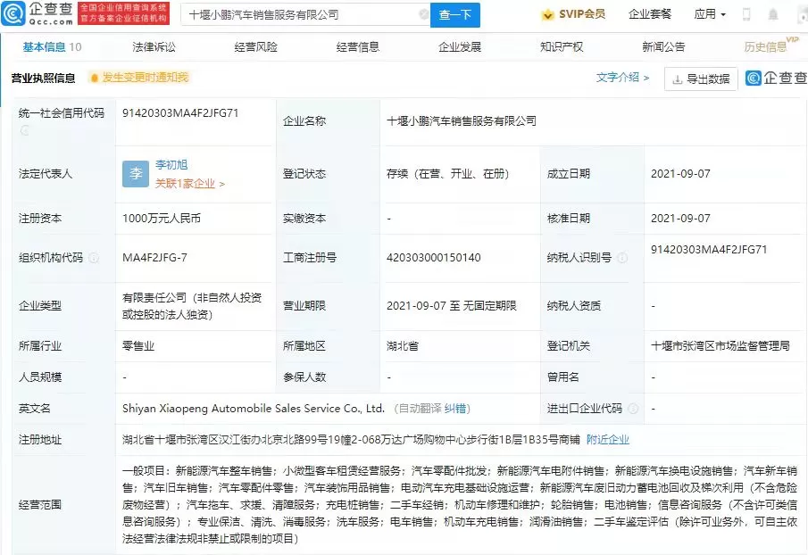 企查查APP显示,9月7日,十堰小鹏汽车销售服务有限公司成立,法定代表人为李初旭,注册资本1000万元人民币,经营范围包含:新能源汽车整车销售;小微型客车租赁经营服务;充电桩销售;二手车鉴定评估等。