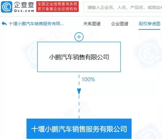 企查查股权穿透显示,该公司由小鹏汽车销售有限公司100%控股。