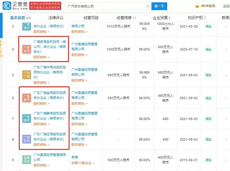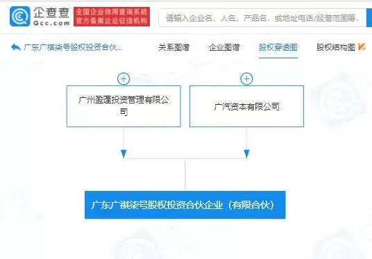 企查查股权穿透显示,该公司由广州盈蓬投资管理有限公司、广汽资本有限公司共同持股。此前,广汽资本已投资成立广东广祺一至六号股权投资合伙企业(有限合伙),执行事务合伙人均为广州盈蓬投资管理有限公司。