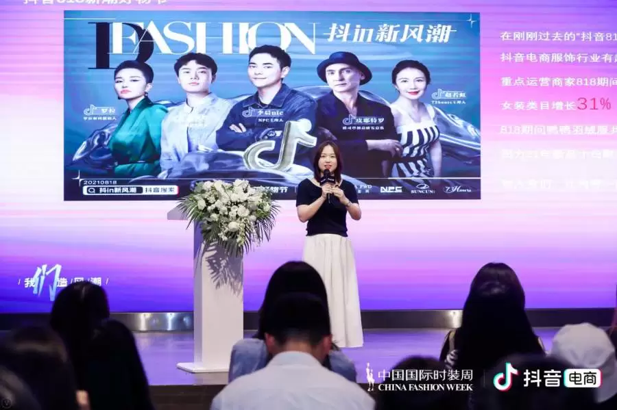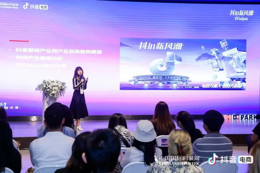 在2021年中国国际时装周期间,抖音电商与时装周再度深化合作,开启SS22中国国际时装周 · 抖in新风潮主题活动,包括主题时装秀、论坛、抖in新风潮DFashion互动展等多项活动。其中,中国国际时装周 · 抖in新风潮日DFashion时装秀,旨在将新锐设计师品牌推向大众视野;时尚论坛以“聚力抖音电商 造时尚新风潮”为主题,介绍了抖音电商服饰行业发展现状,分享优秀原创品牌商家案例并交流抖音电商在市场产业的布局及规划;同时,在论坛中,抖音电商服饰行业也正式推出了孵化和扶持新锐设计师及新锐服饰品牌发展的阵地——DFashion。