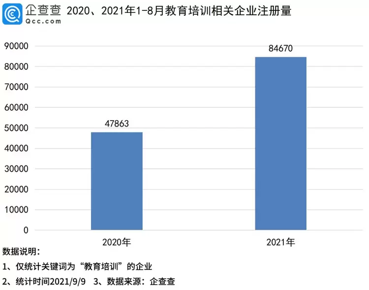 企查查数据显示,2020年新增教育培训相关企业注册量4.8万家,今年1-8月共新增8.5万家相关企业,同比增长77%。
