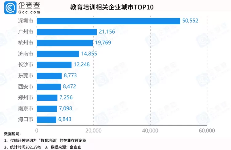 从城市分布上看,企查查数据显示,教育培训相关企业存量前10的城市中,有3座城市都来自广东省,包括深圳市、广州市和东莞市,其中深圳市数量最多,达5.1万家,占据了广东省总量的50%。杭州市、济南市以及长沙市分别近2万家、1.5万家和1.2万家位列三至五位。