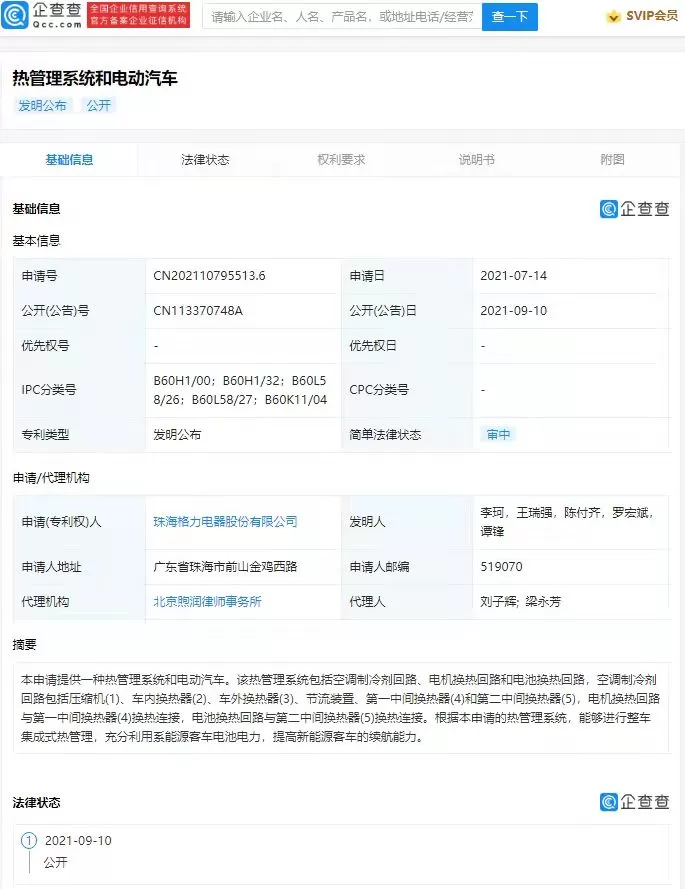 企查查APP显示,9月10日,格力电器(000651)公开“热管理系统和电动汽车”专利,公开号为CN113370748A。