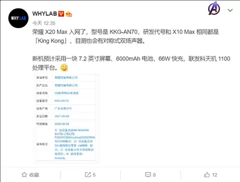 荣耀X20 Max曝光!7.2英寸巨屏+6000mAh,价格很心动