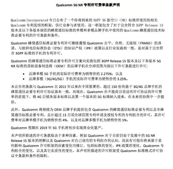 附:高通5G NR专利许可费率条款声明: