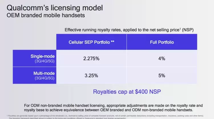 此外,高通还提供包含高通的蜂窝通信标准必要专利以及非蜂窝通信标准必要专利、总计超过13万项全球范围专利申请及授权专利的专利组合的许可,其许可费率对品牌单模手机为销售价的4%,以及对品牌多模手机为销售价的5%。