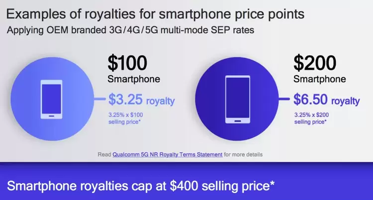 据悉,高通的蜂窝通信标准必要专利许可方案向实施包括3GPPRelease 15版本及以下各版本5G NR标准的原始设备制造商(OEM)的品牌手机在全球范围内按以下许可条款进行许可:单独使用移动网络核心专利,品牌单模5G手机的实际许可费率为销售价的2.275%;以及品牌多模(3G/4G/5G)手机的实际许可费率为销售价的3.25%。