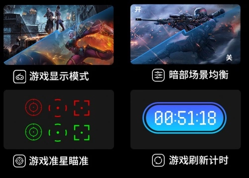 HKC MiniLED显示器PG27P5U还整理出了目前市面常见游戏的最佳显示设置模式值,将其预置于显示器内,分别有游戏显示模式、暗部场景均衡、游戏准星瞄准和游戏刷新计时四种模式,力求为玩家带来最佳游戏画质,提升游戏对决体验。