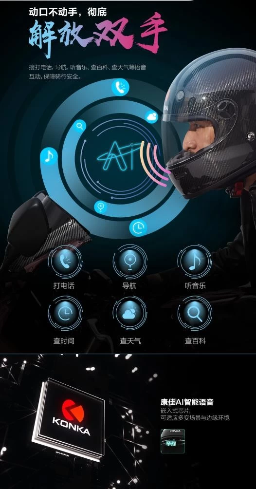 据康佳AI智能头盔相关负责人介绍,康佳AI智能头盔是国内首款智能头盔,具有全方位安全设计,高强度多层壳体守护等特点,使得头盔更硬更轻更安全。其人体工程学设计合脸型更合心意。该头盔还可以在基本的安全辅助下成为一个两轮车的智能助手和智慧大脑,对驾驶员而言,其四肢只需要专注于驾驶,其他的接听拨打电话,导航,听音乐,查天气等操作通过动动嘴就能实现。这对越来越依赖手机的人们来说,无疑是一个全新的选择和体验。“未来,随着智能技术的发展,康佳AI智能头盔还将实现更多的智能应用,以提高产品附加值,增加安全和便利性能。”该负责人进一步表示。